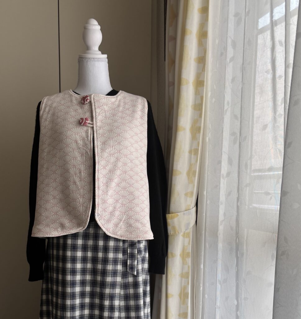 和柄とワッフルのくるみボタン付きリバーシブルベスト お孫さんに和柄とワッフルのくるみボタン付きリバーシブルベストをご注文くださったオーダー主さま、お孫さんとお揃…