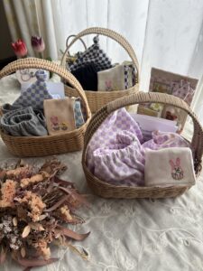 桜模様とピンクのワッフル生地のリバーシブルベストや紫陽花柄のガーゼ生地を気に入ってくださり、ご予算と合わせてお気に入りのセットになるようにご相談させていただきました。すぐに役立つコンビ肌着や、とても便利なブルマパンツ、そして和柄とガーゼのリバーシブルスタイは紐で結ぶタイプに。ブルマパンツは定番の和柄のものと綿ブロード生地のギンガムチェックの2枚。どちらも使いやすくてヘビーローテーション入りになりそうです!リバーシブルベストは少し大きめサイズですが、きっともうすぐやって来る桜の季節にぴったりサイズ!