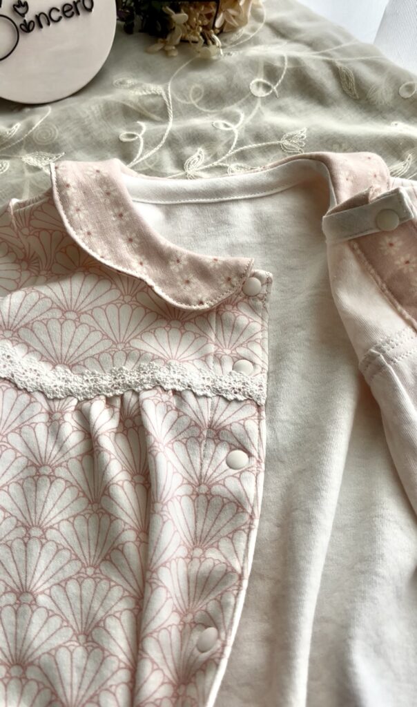 今回は、新米ママと新米パパご夫婦のお好みをオーダー主様から教えていただき、ダブルガーゼの襟をつけさせていただきました。胸元のレースは新米ばあばのお気に入りです!