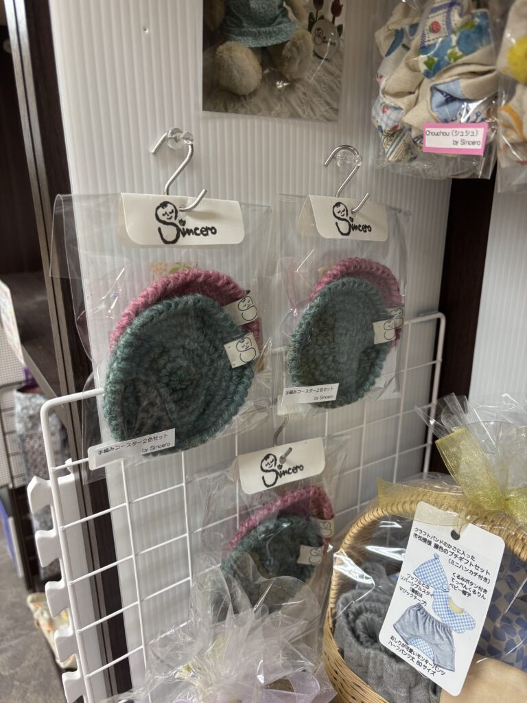 ギフトセットと共に、新しく手編みのコースター2色セットも置かせていただきました。