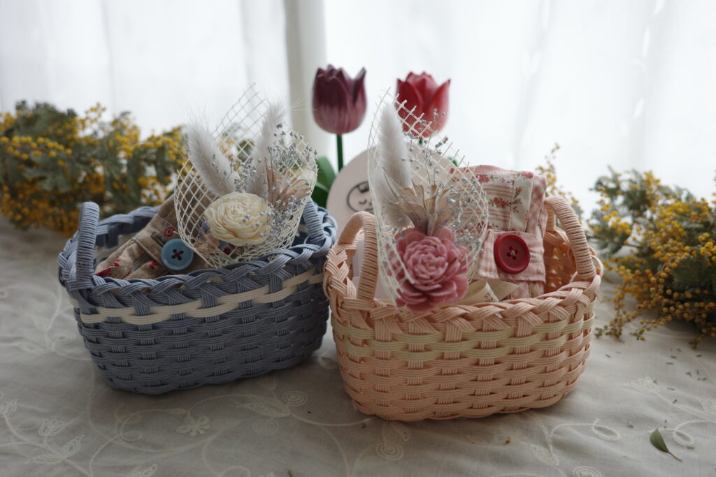 どのセットもクラフトバンド作家さんに作っていただいた可愛いかごに入れています。とても丁寧に編まれていますので、小物入れなどにお使いいただけます。