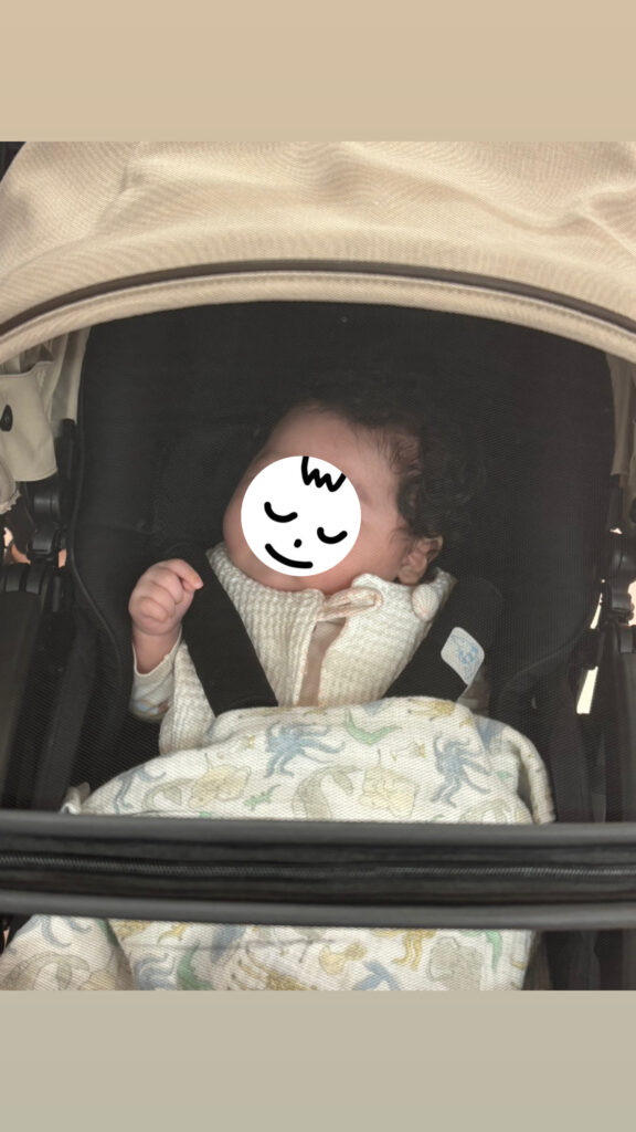 生後2ヶ月と少し、とってもすくすくと成長され、カバーオールの第1スナップを止めないで着用されているとのこと。