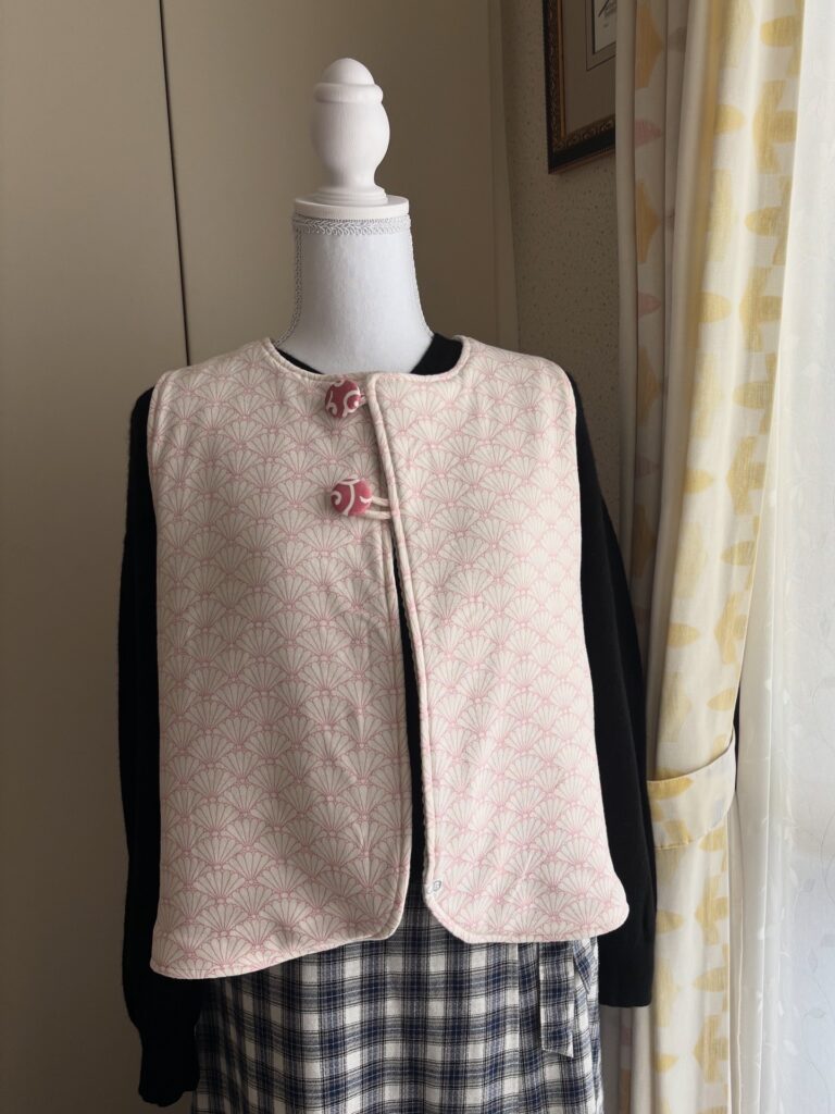 和柄は同じ扇模様で、ワッフルも和柄も色違い、デザインもくるみボタンを2つにして大人用に仕立てました。
