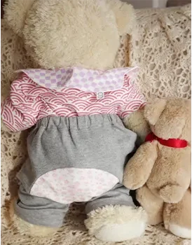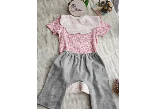 セットには、青海波模様 木槿色(むくげいろ)のお着替え楽ちん半袖ロンパース、桜模様マチが可愛いクロップド丈のおしりが可愛いモンキーパンツ(共に80サイズ)、もこもこ雲型がキュートな桜模様と市松模様 藤紅色のリバーシブルスタイが入っています。